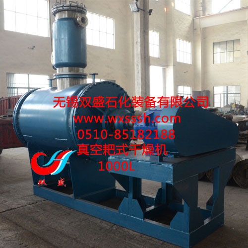 被干燥物料從殼體上方正中間加入,在不斷正反轉動的耙齒的攪拌下,物料軸向來回走動,與殼體內壁接觸的表面不斷更新,受到蒸汽的間接加熱,耙齒的均勻攪拌,粉碎棒的粉碎,使物料內的水份氣化,在真空系統的作用下,使被干燥物料內部水份和表面水份更有利的排出,氣化的水份經干式除塵器、濕式除塵器、冷凝器,從真空泵出口處放空。